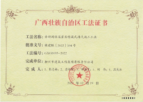 2022年12月19日,廣西建筑業(yè)聯(lián)合會(huì)發(fā)布《關(guān)于公布2022年廣西壯族自治區(qū)級(jí)工程建設(shè)工法名單的通知》,我司申報(bào)的《高層建筑鋼筋砼結(jié)構(gòu)連梁施工工法》和《非封閉保溫屋面隱藏式排汽施工工法》2個(gè)工法榜上有名。這是對(duì)柳建集團(tuán)公司工程技術(shù)人員工法編制能力的充分肯定,也是集團(tuán)公司一直以來(lái)對(duì)加強(qiáng)工法的研發(fā)和應(yīng)用,加快技術(shù)積累和科技成果轉(zhuǎn)化,增強(qiáng)集團(tuán)公司科技創(chuàng)新能力和企業(yè)的核心競(jìng)爭(zhēng)力堅(jiān)守的成果,為公司提高工程質(zhì)量管理,建造精品工程奠定了堅(jiān)實(shí)基礎(chǔ)。